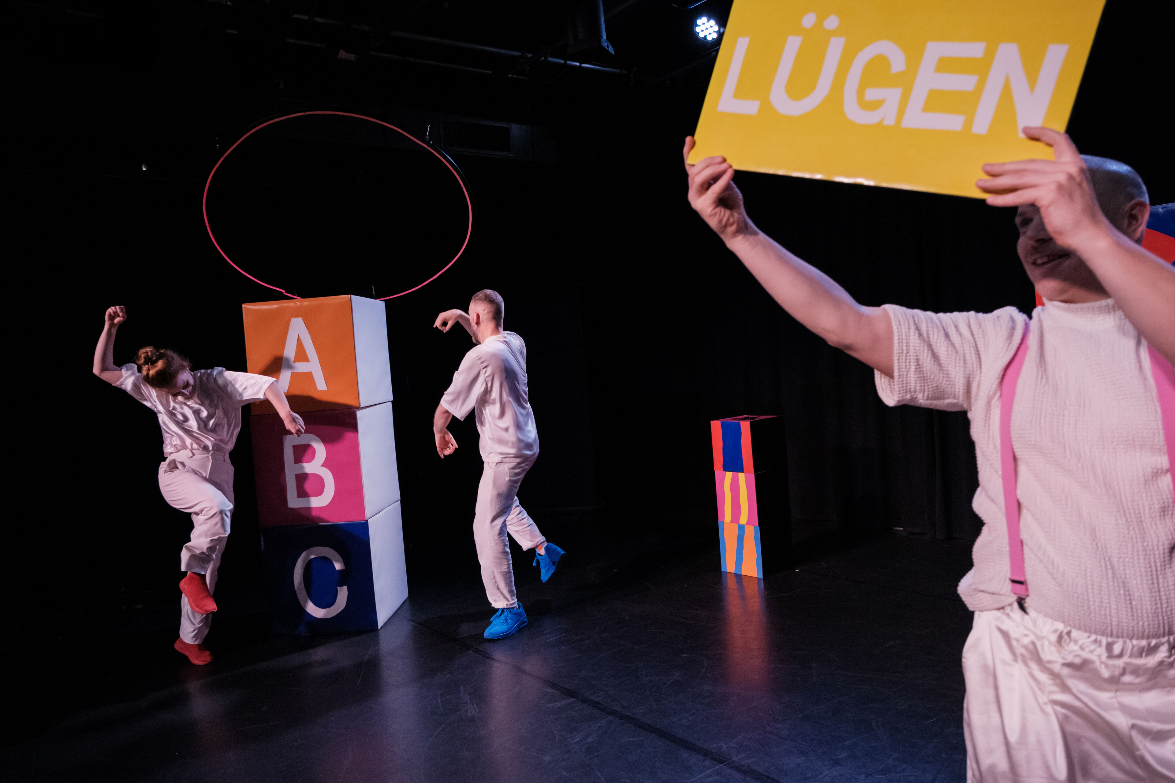 Die altersOffene PerfOrmance O entführt alle ab 6 Jahren in die fantasievOlle Welt der Buchstaben, WÖrter und ihrer Bedeutung. Ausgehend vOn der FOrm O testen Jan Kress, Julia Keren Turbahn und Jan ROzman gemeinsam mit dem Publikum die Grenzen unserer KOmmunikatiOn aus und zeigen auf spielerische Art und Weise, wie beweglich unsere Sprache sein kann. WOraus bestehen eigentlich Buchstaben?