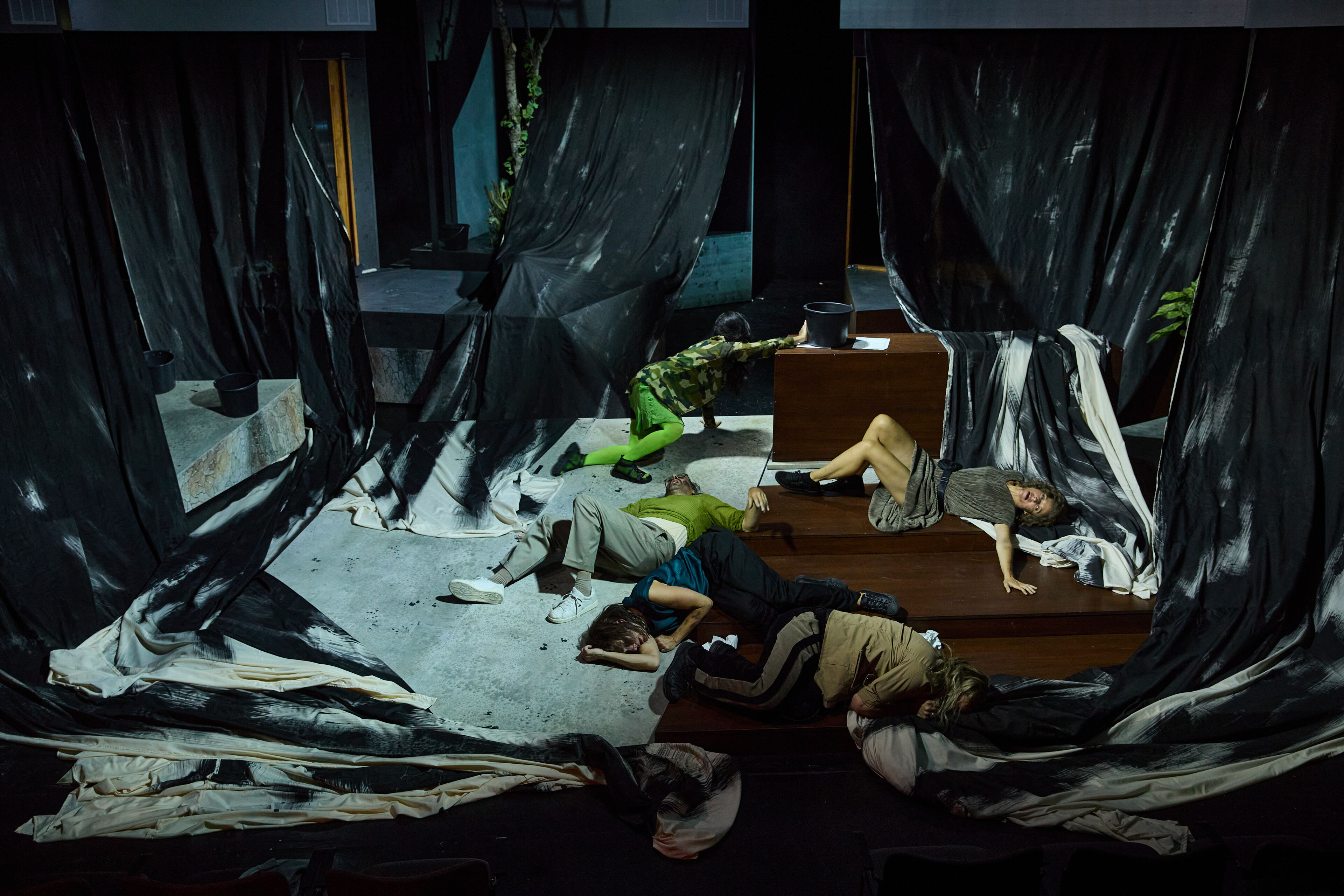 In ihrer Recherche stoßen die fünf Künstler*innen auf die historische Gruppe um Mary Shelley, die 1816 ebenfalls in einem Haus am Genfer See „Frankenstein“ schrieb – quasi eine Kunst-Residency Anfang des 19. Jahrhunderts. Eingeschlossen in einer prunkvollen Villa experimentierten diese fünf jungen Menschen neben der Kunst auch mit offenen Beziehungen und Drogen, diskutierten die Abschaffung des Staates und der Ehe, bewegten sich zwischen Aristokratie und Anarchie, während um sie herum die Katastrophe wütete.
