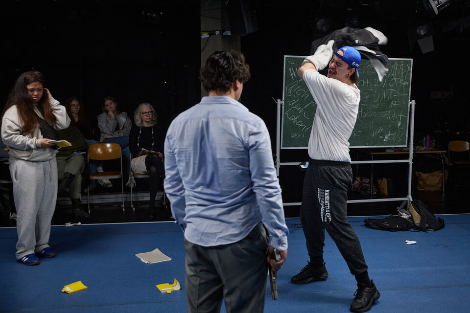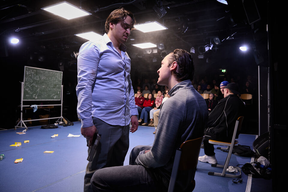 Schauplatz Klassenzimmer: Ein Lehrer scheitert daran, seiner aufmüpfigen und augenscheinlich migrantisch besetzten Klasse die Werke Friedrich Schillers näherzubringen. Als er während eines Tumults im Klassenraum in den Besitz einer Waffe gelangt, eskaliert die Situation: Er nimmt die Jugendlichen als Geiseln und zwingt sie, Schiller-Texte vorzutragen. Unter Waffengewalt versucht er so, ihnen die Ideale der Aufklärung – Vernunft, Freiheit und die Würde des Menschen – einzubläuen. Ein Widerspruch! Nach und nach beginnt die Rollenverteilung zwischen Lehrer und Schüler*innen zu verschwimmen: Wer in diesem Kammerspiel ist eigentlich Lehrende*r, wer Lernende*r – wer ist wirklich Opfer und wer Täter? „Verrücktes Blut“ ist eine Mischung aus Thriller, schwarzer Komödie und Gesellschaftsdrama und entwickelt sich zu einem wahnwitzigen Lehrstück über Macht, Moral, das Versprechen von Bildung als Weg zum sozialen Aufstieg und die Suche nach dem eigenen Platz in der Gesellschaft. Vor dem Hintergrund einer aktuell erneut aufgeheizten Migrationsdebatte wirft das Stück Fragen auf über strukturelle Benachteiligung, Teilhabe und gesellschaftliche Akzeptanz.
