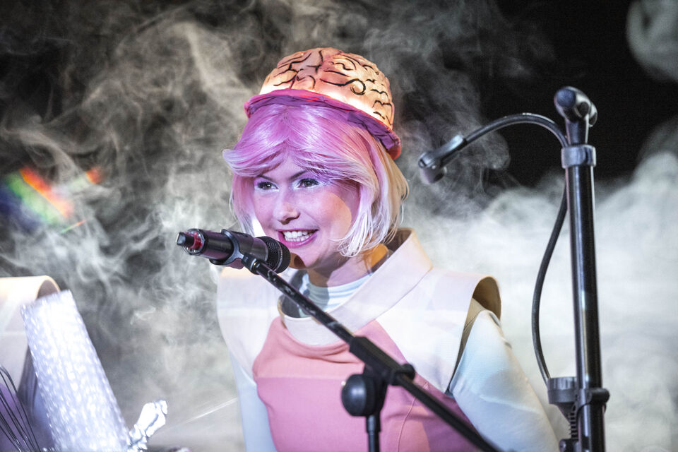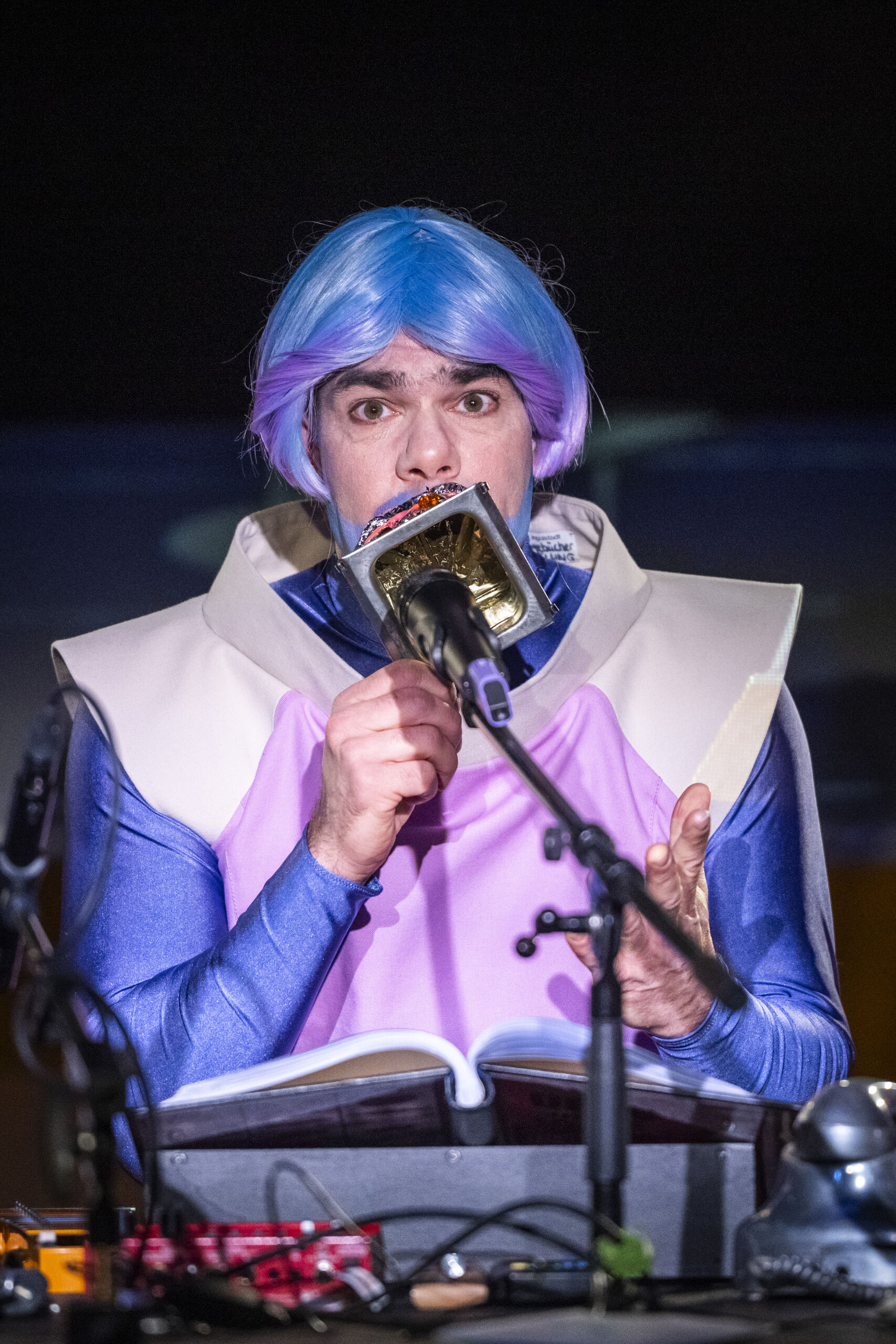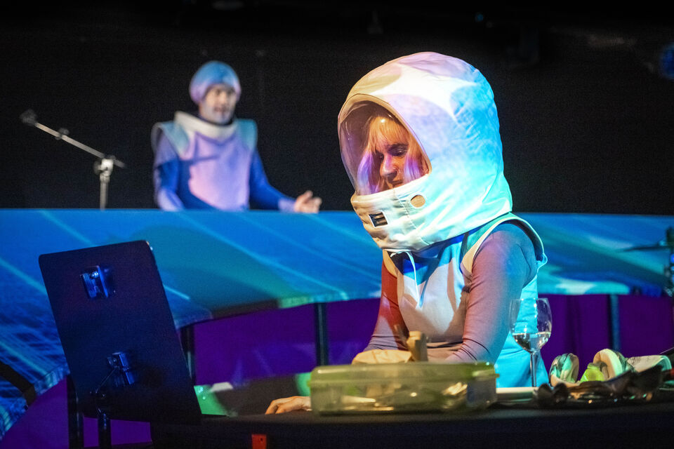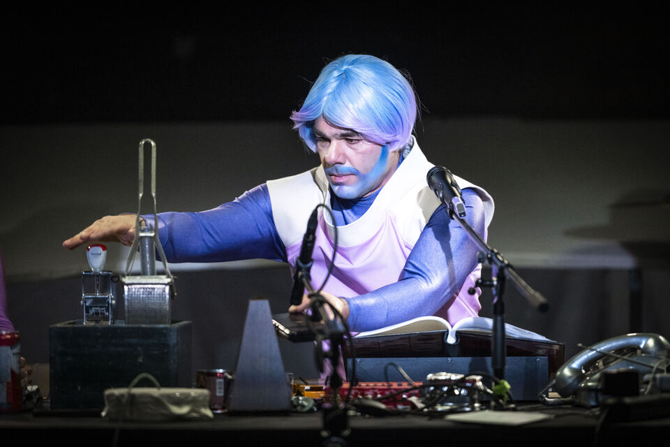 Der Regisseur Eike Hannemann verwandelt die Werkstattbühne in die Schaltzentrale für ein Live-Hörspiel. Schauspieler*innen schlüpfen in die Rollen der schrägen Figuren, sprechen live ins Mikro und erzeugen sämtliche Geräusche eigenhändig: Eine Sprühflasche könnte das Quietschen eines Raumanzugs simulieren, eine Wasserflasche zum interstellaren Sturm werden. Dinge, die eher im Haushalt als im Orbit zu finden sind, verwandeln sich in kosmische Klangwunder. Ein bisschen Science, eine Prise Fiction und ein gutes Quäntchen Fantasie – dieses Live-Hörspiel lädt dazu ein, gemeinsam mit Ijon Tichy über die Absurditäten des Menschseins zu staunen.