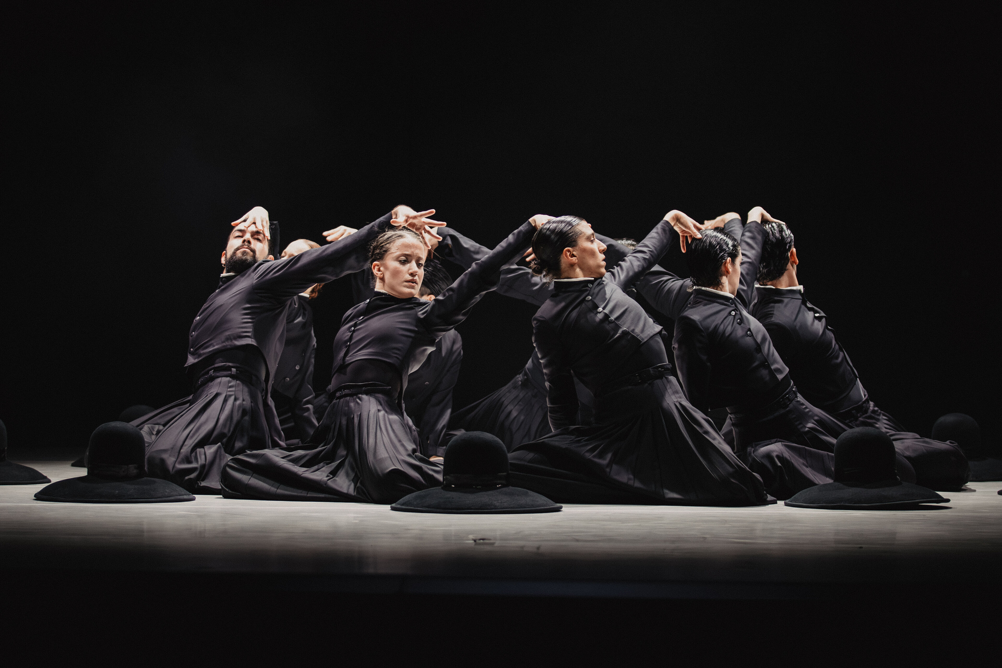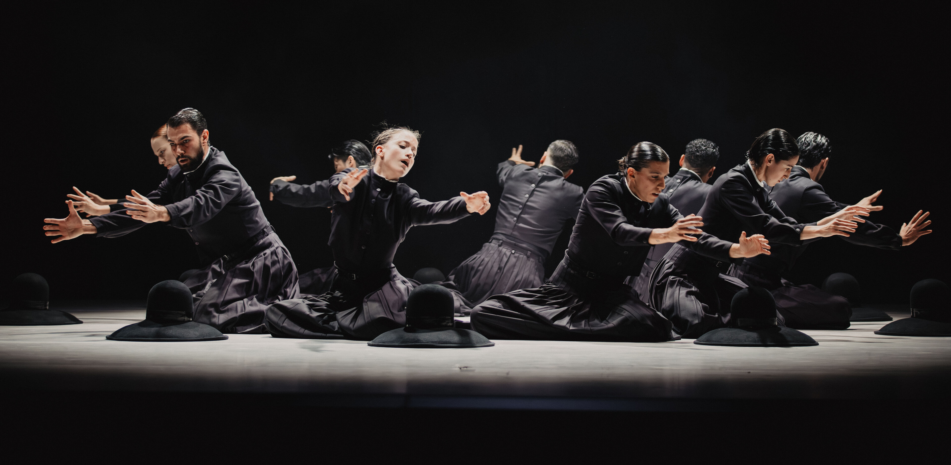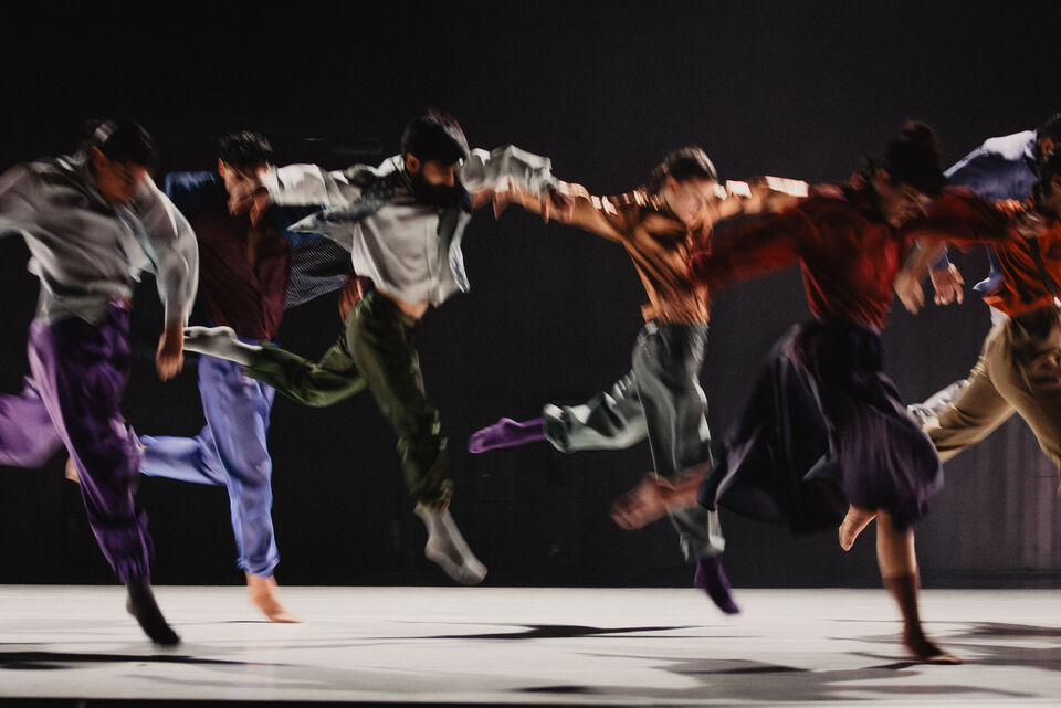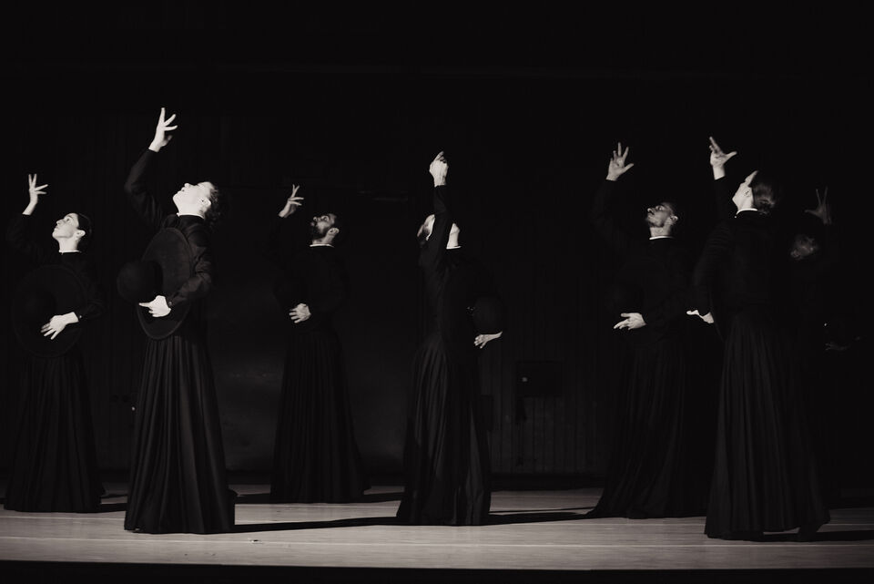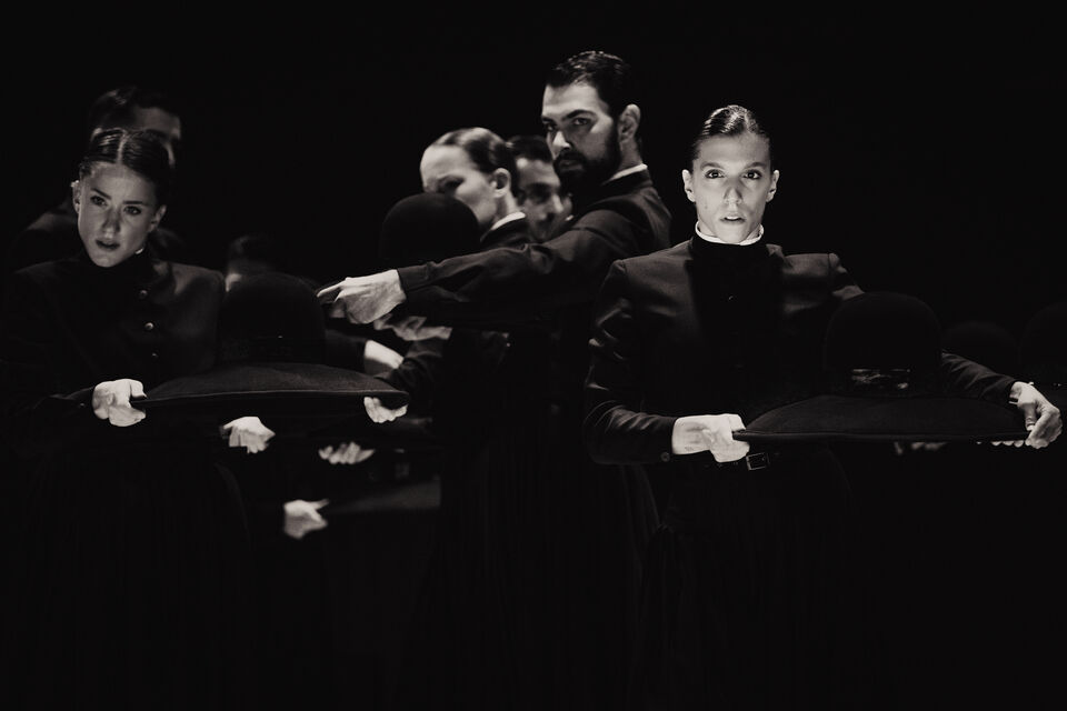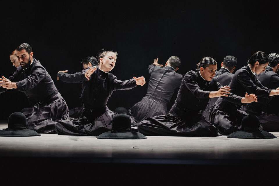 Im zweiten Teil folgt der pulsierende Boléro. Dessen elementaren Beat erforscht Sita Ostheimer choreografisch und blickt dabei hinter Ravels Mythos – auf das, was uns Menschen antreibt. Denn alles Leben pulsiert im Rhythmus: Herzschlag, Atem und Schritte. Parallel zur Musik wächst auch die Choreografie zum körperlichen Crescendo: Vom feinen Fingerspiel steigert sich die Dance Company – immer schneller, höher, weiter – bis zur völligen Erschöpfung. Der Verzicht auf Bühnenbild und Illusion rückt den Menschen in den Mittelpunkt und lässt das Rohe und Unperfekte sichtbar werden – unser Sehnen, Scheitern und Wiederaufstehen. Klatschen und Stampfen verweisen dabei auf die volkstänzerischen Wurzeln des Bolero.