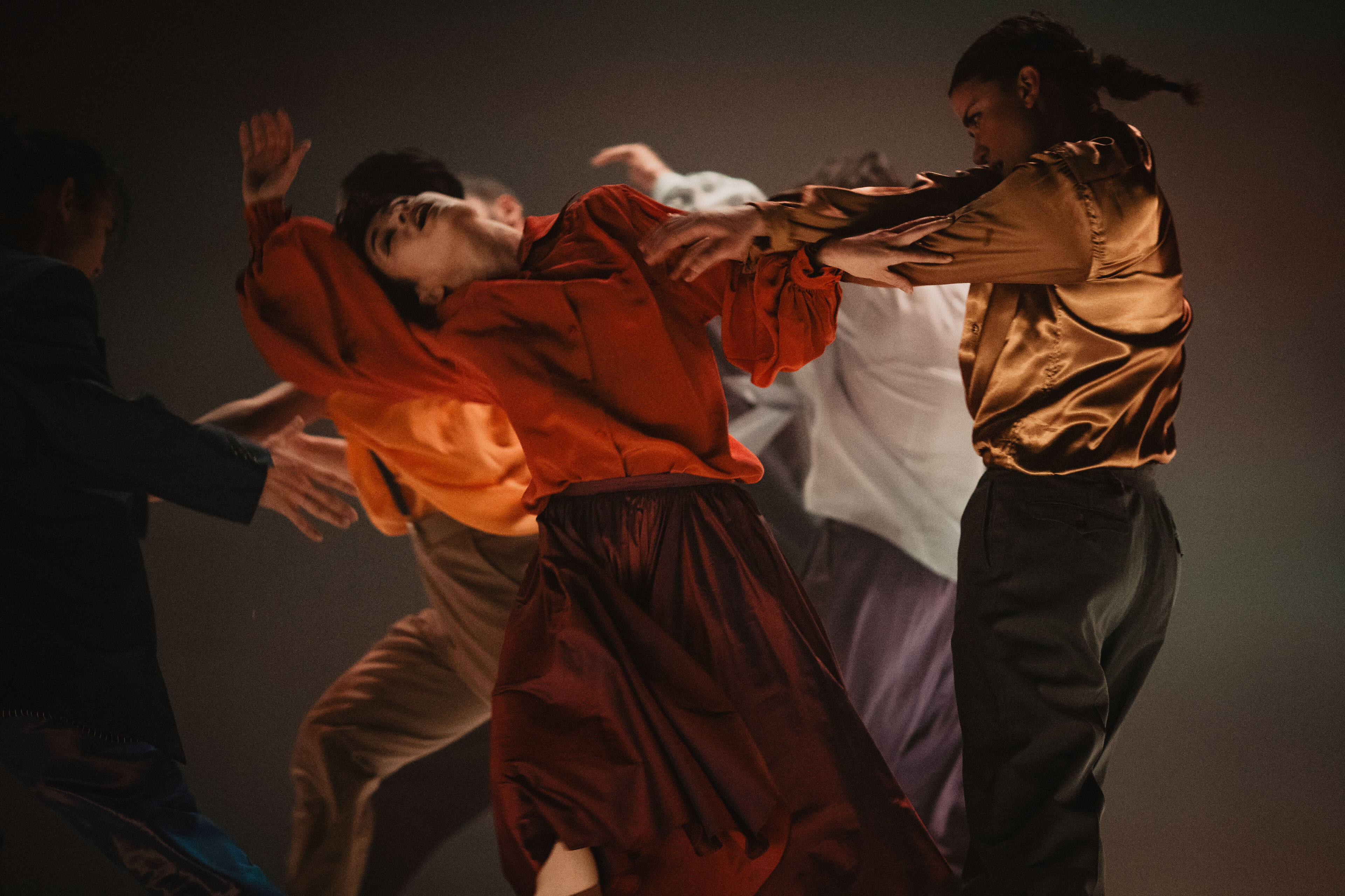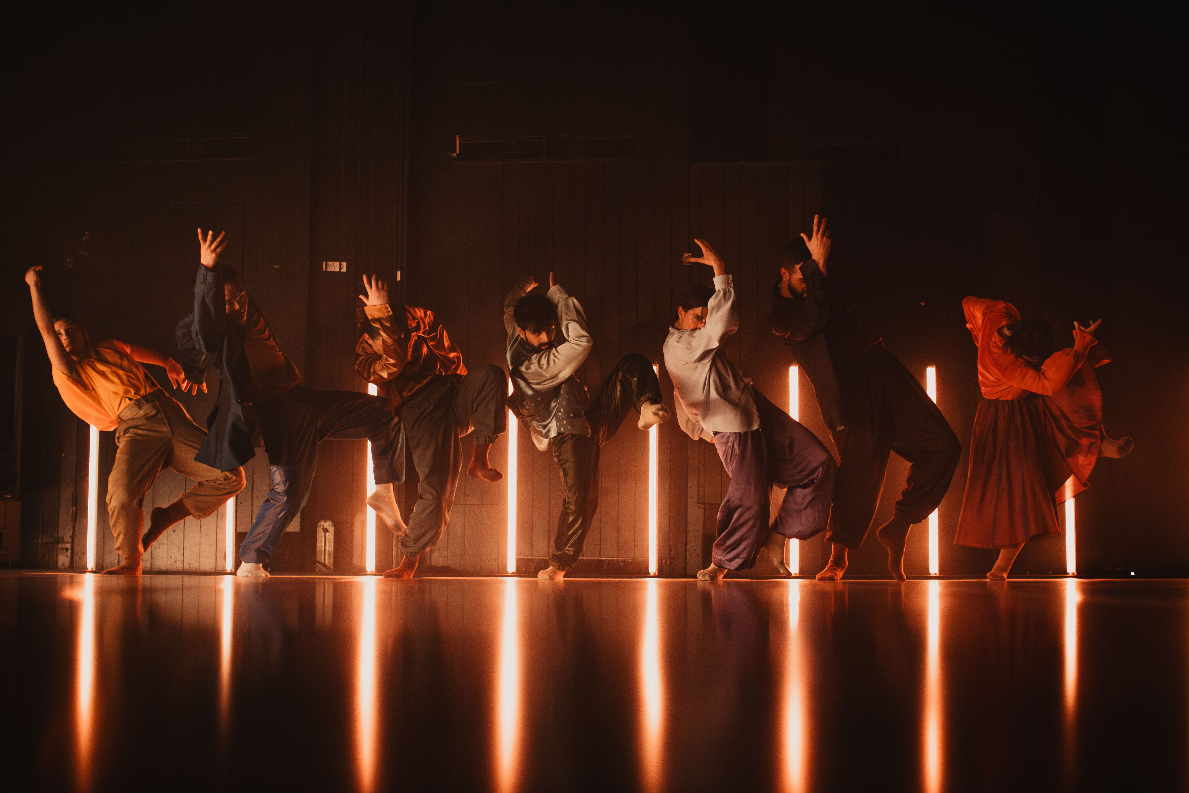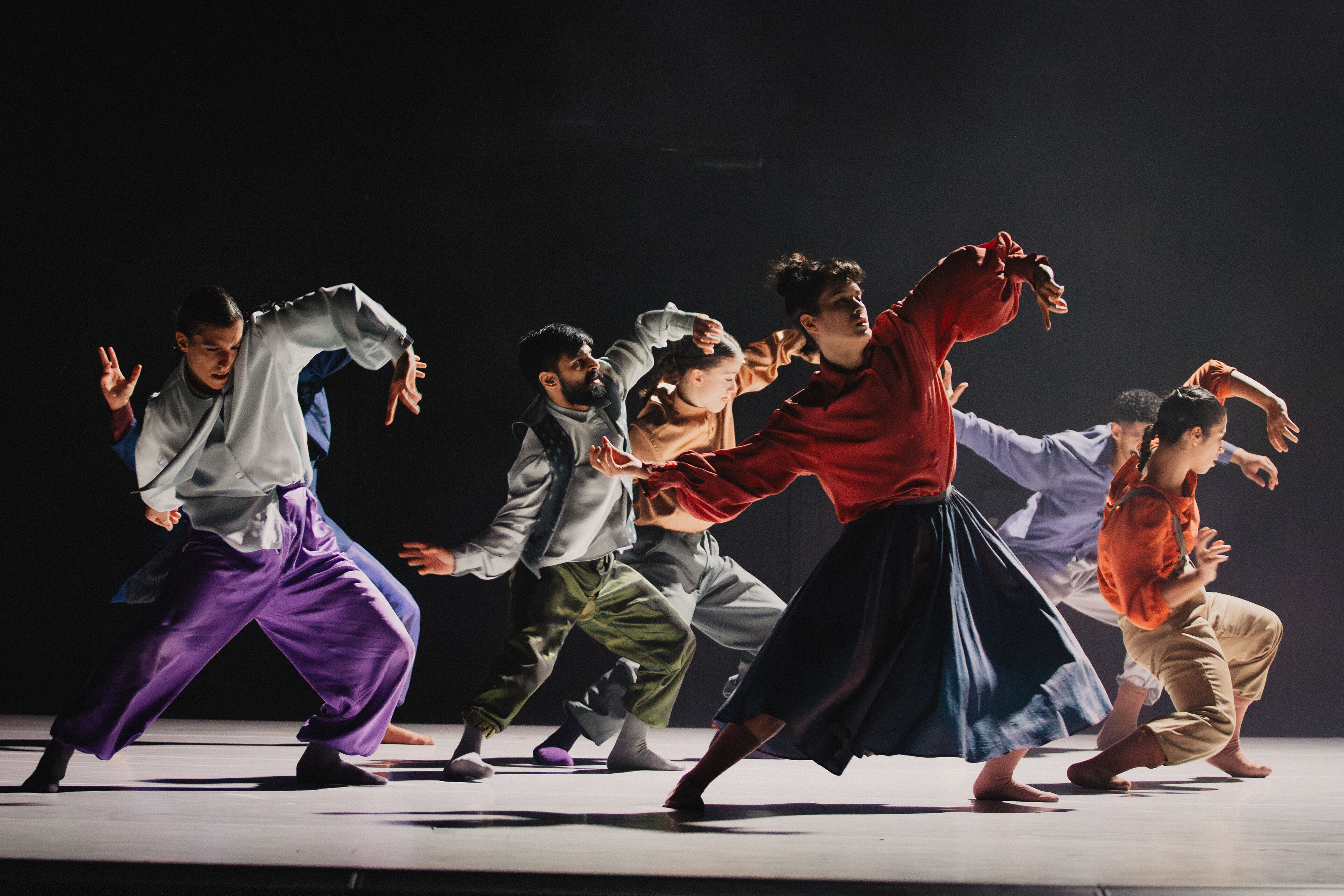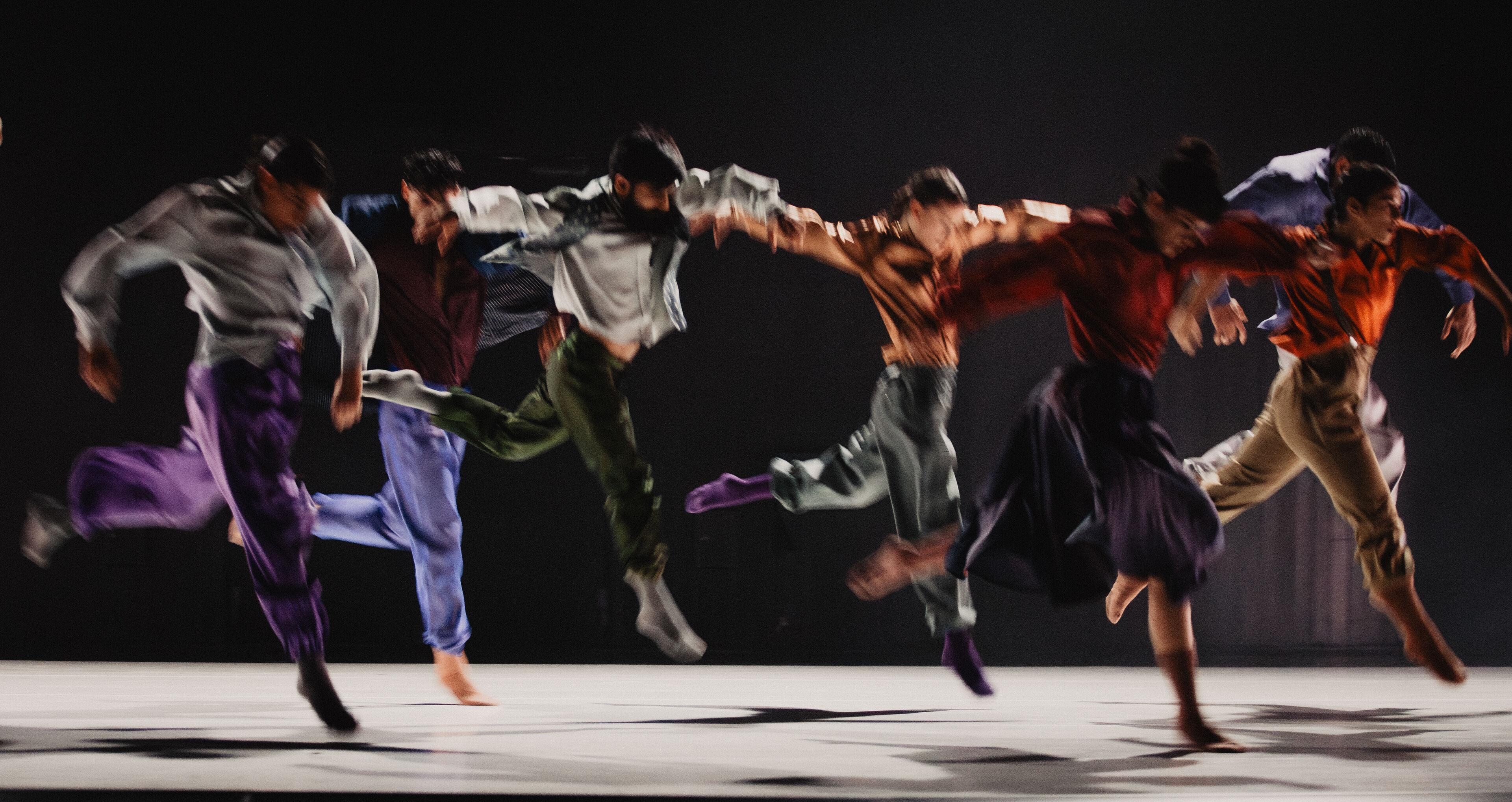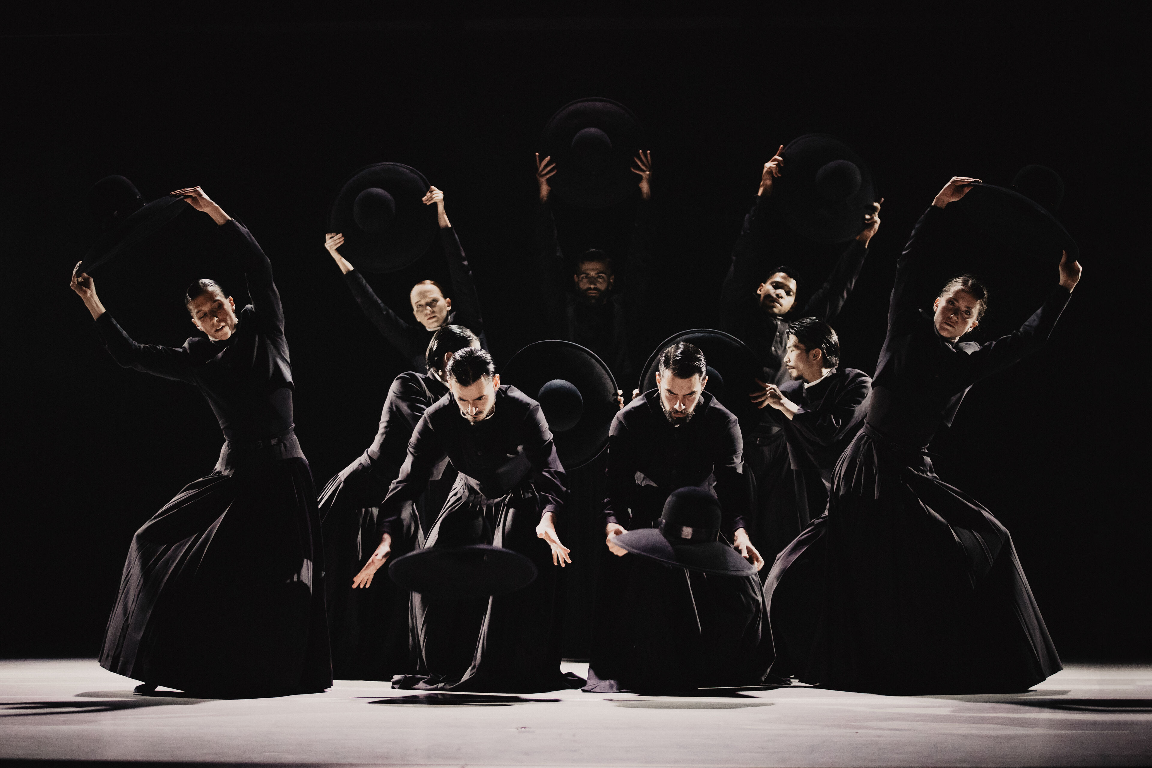 Im zweiten Teil folgt der pulsierende Boléro. Dessen elementaren Beat erforscht Sita Ostheimer choreografisch und blickt dabei hinter Ravels Mythos – auf das, was uns Menschen antreibt. Denn alles Leben pulsiert im Rhythmus: Herzschlag, Atem und Schritte. Parallel zur Musik wächst auch die Choreografie zum körperlichen Crescendo: Vom feinen Fingerspiel steigert sich die Dance Company – immer schneller, höher, weiter – bis zur völligen Erschöpfung. Der Verzicht auf Bühnenbild und Illusion rückt den Menschen in den Mittelpunkt und lässt das Rohe und Unperfekte sichtbar werden – unser Sehnen, Scheitern und Wiederaufstehen. Klatschen und Stampfen verweisen dabei auf die volkstänzerischen Wurzeln des Bolero.